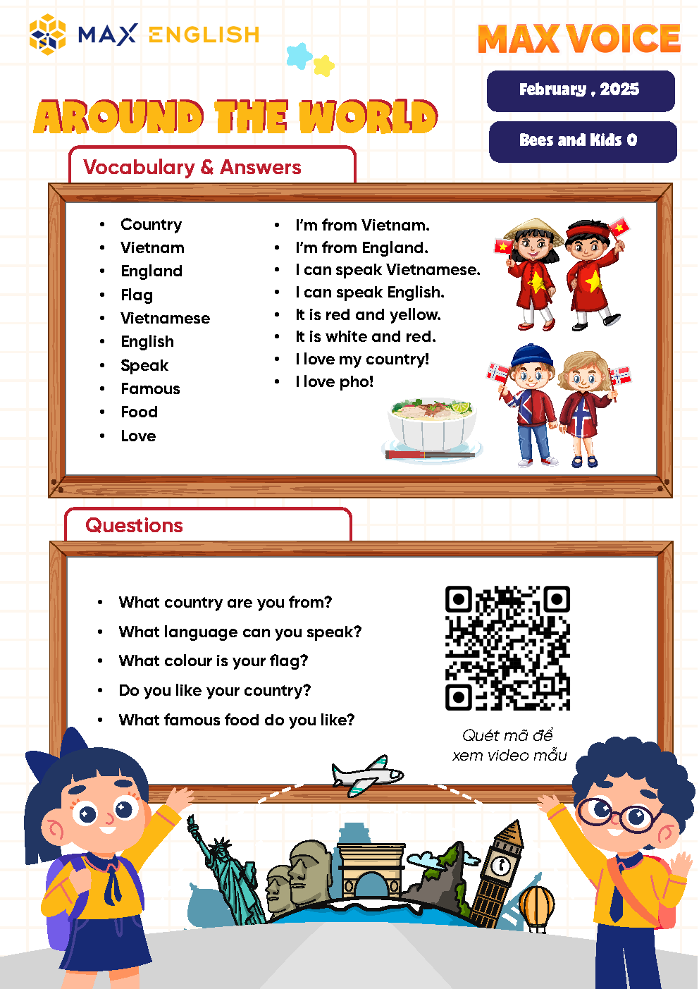 Trong dự án MAX Voice tháng 02/2025 với chủ đề "Around the World", học sinh sẽ trở thành những "travel expert nhí", khám phá từ vựng, mẫu câu giao tiếp khi đi du lịch và tìm hiểu về các quốc gia trên thế giới: